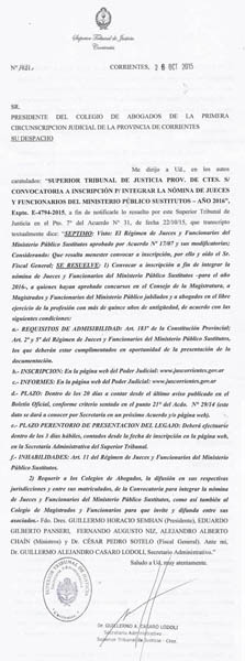 El Colegio Público de Abogados de la Primera Circunscripción Judicial de Corrientes, con la firma de su Presidente Dr. Ricardo Manuel Villar, informa a sus matriculados que el Superior Tribunal de Justicia de la Provincia de Corrientes llama a inscripción para integrar la nómina de Jueces y Funcionarios del Ministerio Público Sustitutos para el año 2016, para quienes hayan aprobado concursos en el Consejo de la Magistratura, a Magistrados y Funcionarios del Ministerio Público Fiscal jubilados y abogados en el libre ejercicio de la profesión con más de quince años de antigüedad.