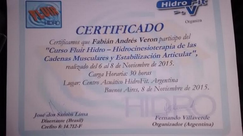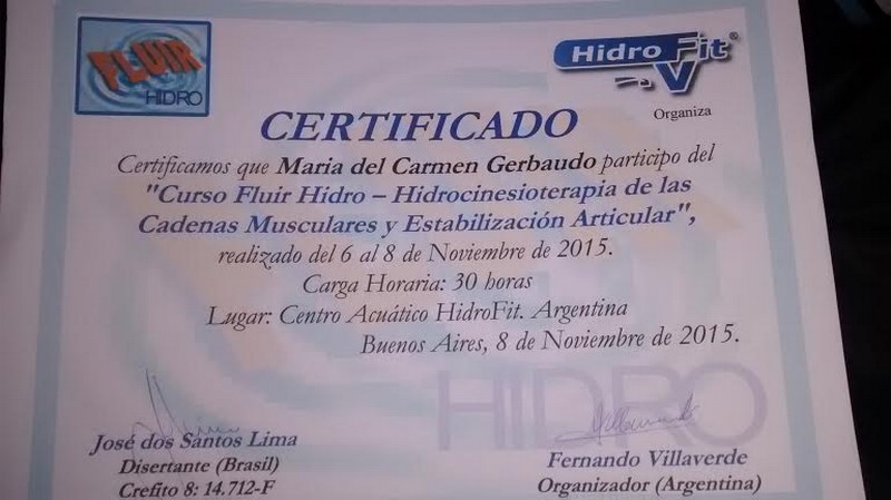 HIDROCINESIOTERAPIA de las CADENAS MUSCULARES, dictado por el Prof. Dr. José Lima. Brasil. Buenos Aires. Argentina. Por dicha participación recibieron el certificado pertinente.