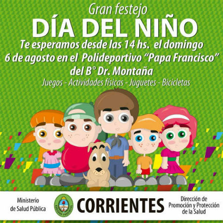 El Ministerio de Salud Pública a través de la Dirección General de Promoción y Protección de la Salud, invita a la jornada que se realizará este domingo desde las 14 en el Polideportivo “Papa Francisco” del barrio Doctor Montaña para festejar el día del niño. Se desarrollarán juegos y diferentes actividades con entrega de premios.