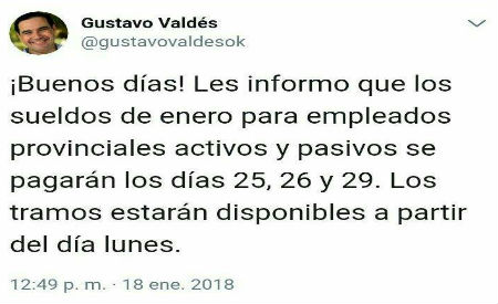 El gobernador Gustavo Valdés anunció este jueves el pago de sueldos para la Administración pública provincial correspondientes a enero. Lo hizo a través de su cuenta oficial de Twitter, donde informó que el cronograma iniciará el 25, continuará el 26 y finalizará el 29 de este mes.