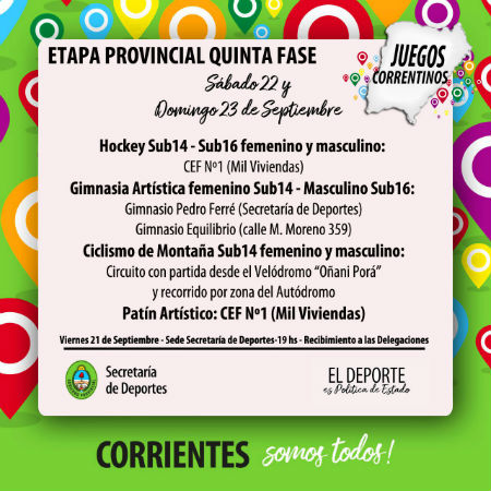 Deportes | Bajo la organización de la Secretaría de Deportes de la Provincia, desde el lunes 8, hasta el jueves 11 de octubre, se desarrollará en esta Capital la fase Provincial de Adultos Mayores de los Juegos Correntinos 2018, clasificatorios a los Nacionales Evita....
