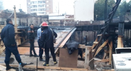 Política | El lugar donde se desató anoche un voraz incendio, en una obra en construcción en la esquina de Junín y San Luis, quedó desmantelado, con amontonamiento de maderas y rastros del paso del fuego. Bomberos están en el lugar realizando las pericias....