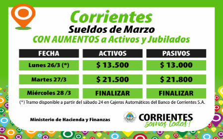 Política | Los haberes se pagarán según el siguiente cronograma: lunes 26 activos hasta $13.500 y jubilados hasta $13.000 (este segmento estará disponible desde mañana sábado 24 en cajeros automáticos); martes 27 de marzo, agentes en actividad hasta $21.500 y pasivos hasta $21.800; en tanto que el pago finalizará para ambos sectores el miércoles 28 del corriente....