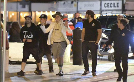 General | Sombrero, traje, joggings, medias altas y chancletas fue la vestimenta elegida por el artista para salir de noche.