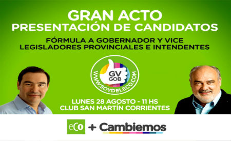 Política | Este lunes a las 11 en el club San Martín de la ciudad de Corrientes, ECO+Cambiemos realizará un acto de presentación de candidatos, con su fórmula a gobernador y vice, Gustavo Valdés - Gustavo Canteros y los postulantes a diputados y senadores provinciales, como así también a intendentes.
