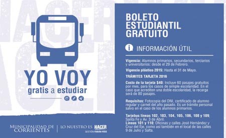 General | La Municipalidad de Corrientes informa que a partir del lunes 29 de febrero estará habilitado el Boleto Estudiantil Gratuito. A través de la tarjeta “Yo Voy”, los estudiantes podrán hacer uso del derecho financiado por la gestión del intendente Fabián Ríos.