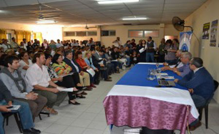 Política | En la delegación del Ministerio de Industria, Trabajo y Comercio de Gobernador Virasoro, los nuevos inversores de la empresa Tapebicuá y los cerca de 500 trabajadores que aguardaban por alcanzar un acuerdo que garantizara sus puestos de trabajo.